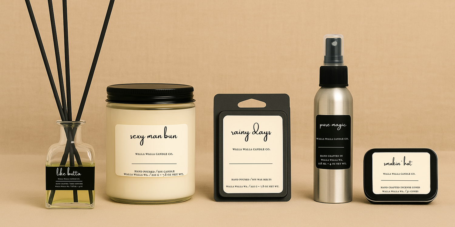 After buying a candle making kit from Amazon and letting it sit completely untouched for about three years, curiosity and boredom from the beginning stages of Covid set in. The bag got opened and a first candle was poured. It was ugly, wasn't level, the scent was too weak and the wick was too small. However, it was definitely a candle and it burned. The fire in that candle lit a love of making candles that was probably always there. The way a scent can bring up vivid memories and how a lit candle can make you feel is definitely the vibe we were going for, and wanted to share with everyone when we started Walla Walla Candle Co.. We hope you love our candles as much as we do! 🖤